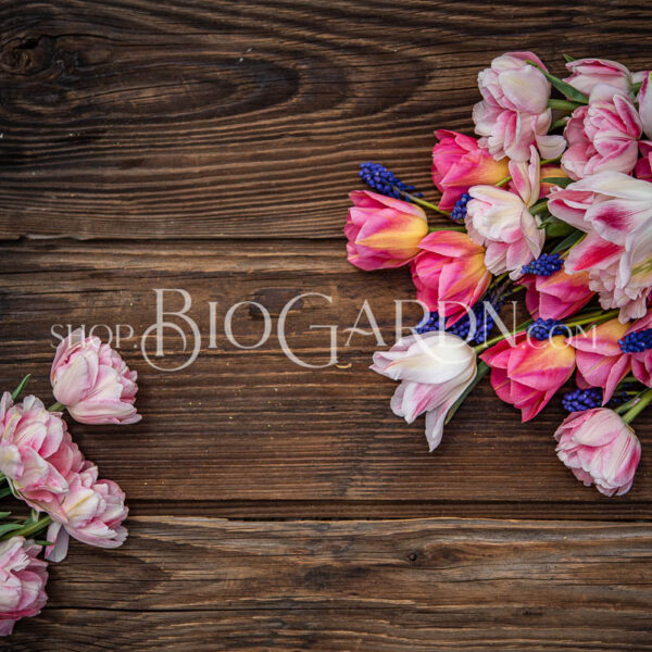 Biogardn Exclusive ® съдържа три сорта нежно розови нюанси, с преливащо бяло, крем и сметана, а за акцент сме добавили малко луковички на мускари.