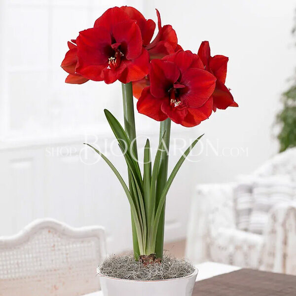 Amarilys Red Jumbo e гигатгски амарилис в червен плюшен цвят. Луковицата, която предлагаме е наистина огромна, което предполага няколко стебла и множество цветове върху тях- кажи -режи цял букет. Идеалният подарък за Коледа, чудесна жива декорация върху празничната маса или просто още едно бижу във вашата зимна градина.