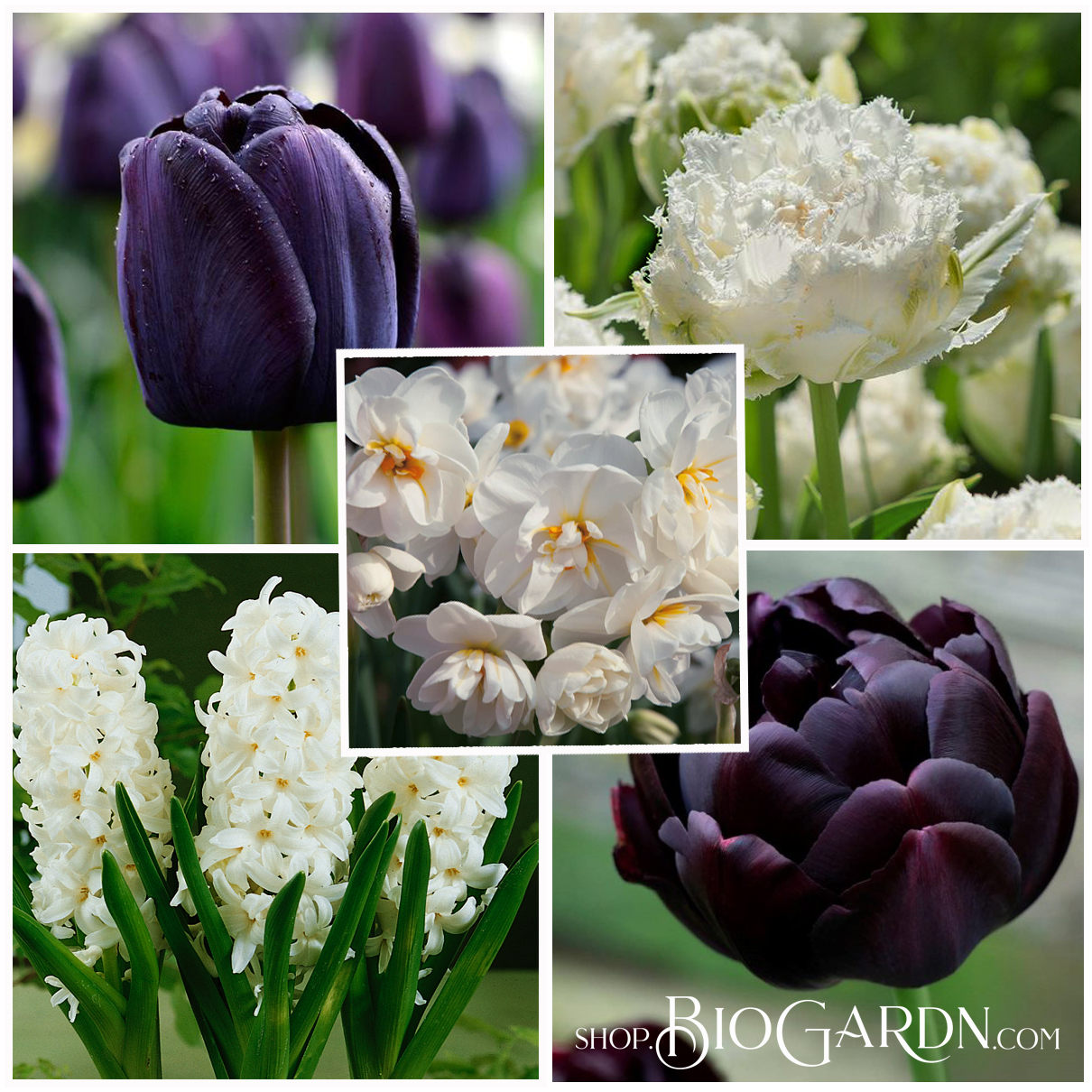 Biogardn Black and white ® съдържа три сорта тъмни лалета в драматичен контраст с бялото ресничесто и кичесто Snow Cristal , за гарантиран изискан ефект и неподражаем стил на вашата градина!