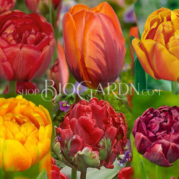 От Биогардн ви предлагаме нашата ексклузивна колекция Fire carpet ® – цветна комбинация от наситени червени, жълти и оранжеви огнени пламъци. Тази колекция ще се представи добре както в градината, така също и засадена в саксия. Разположете луковиците в група от 10 на минимално разстояние една от друга, за максимален ефект на цветовете.