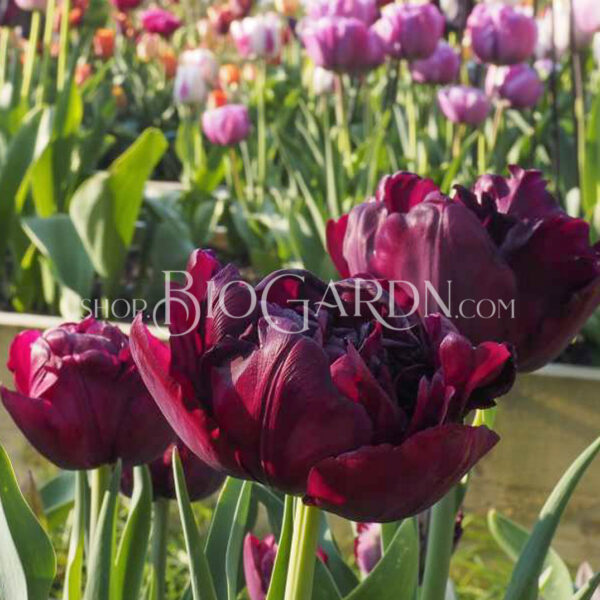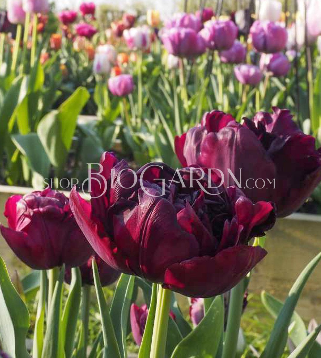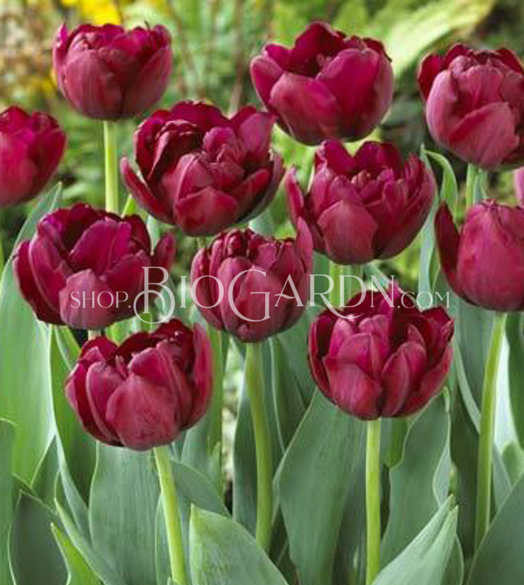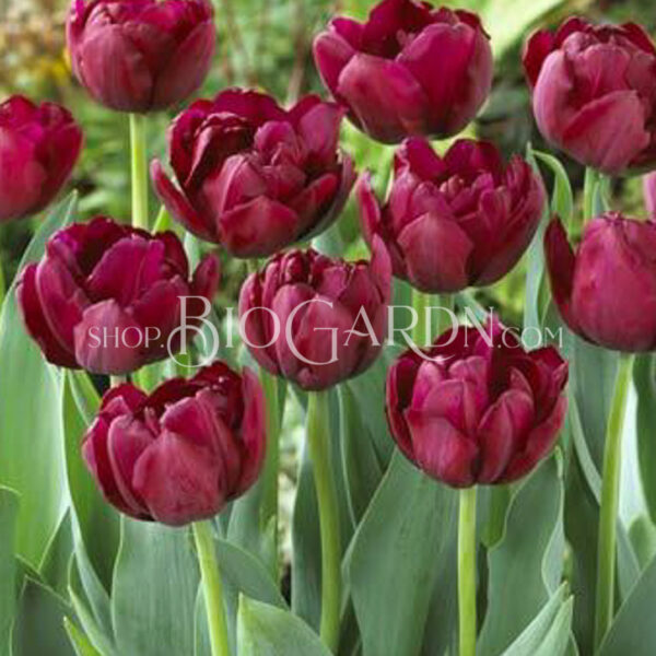 Перфектно оформено двойно късно лале с отлична височина 45 см. Тъмно пурпурно-червените цветя имат кадифен блясък. Луксозен външен вид в комбинация с „Queen of knight “ или закачлив с, например, „Sunlover“.
